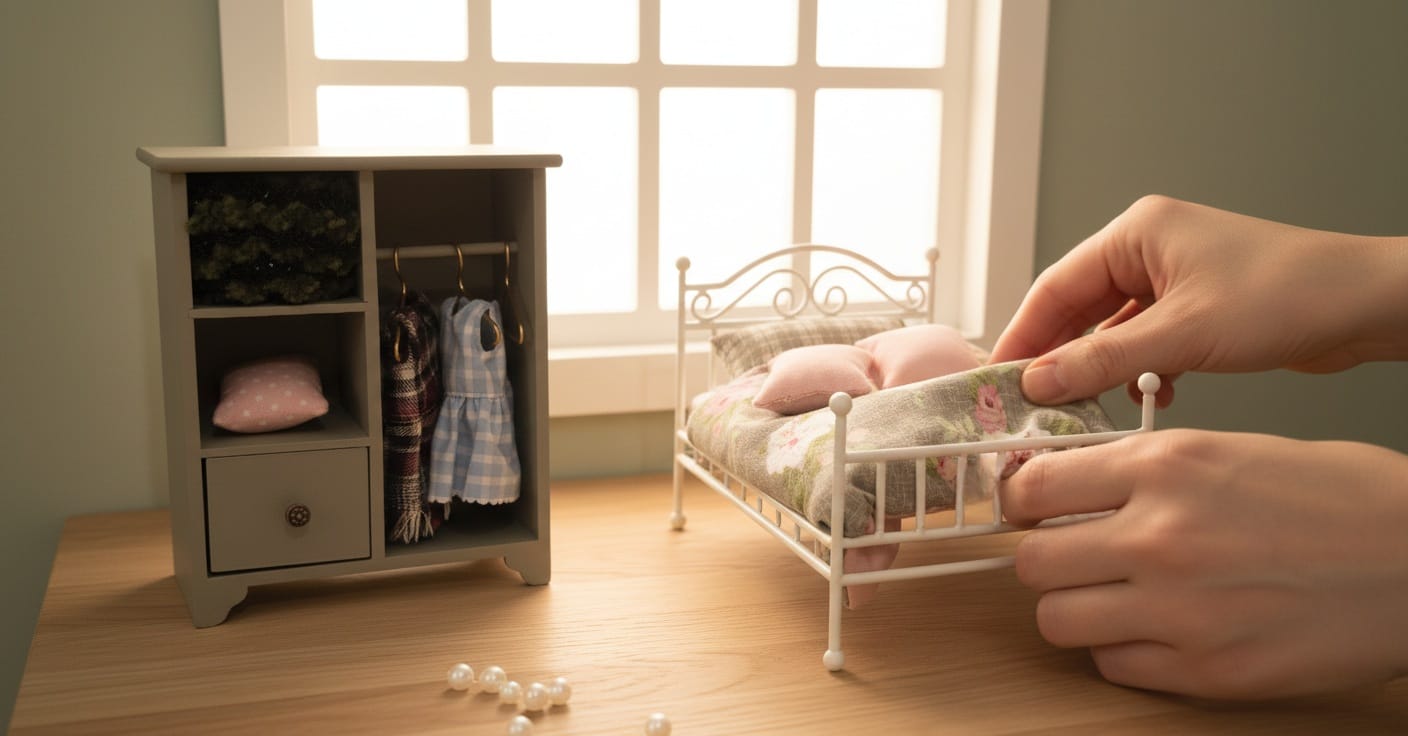 Muñecos de tela pensados para el juego simbólico, la decoración y para habitar casas de muñecas, donde cada detalle invita a imaginar y crear historias propias.
